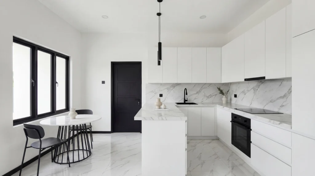 Didesain dengan konsep open space yang elegan, dapur ini menggabungkan fungsionalitas dan estetika modern. Material marmer premium dan pencahayaan hangat menciptakan suasana yang nyaman sekaligus berkelas untuk aktivitas sehari-hari.