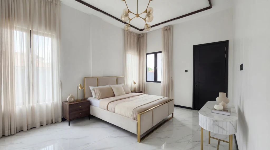 Rasakan kenyamanan luar biasa di kamar yang dirancang dengan nuansa hangat dan estetika modern. Setiap elemen interior — mulai dari pencahayaan lembut hingga material premium — diciptakan untuk menghadirkan suasana tenang dan berkelas bagi penghuninya.
