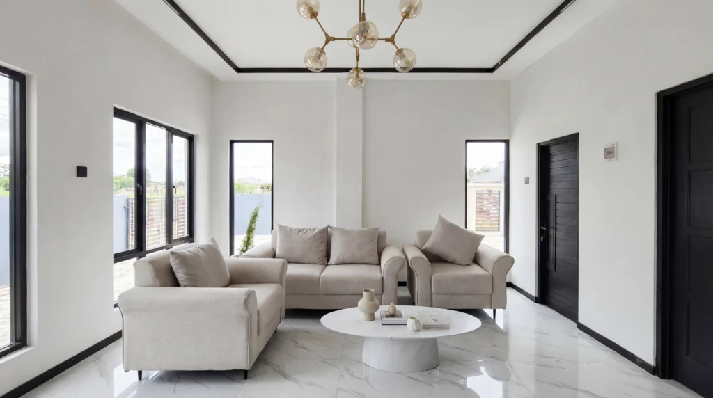 Ruang keluarga dirancang untuk menghadirkan suasana hangat dan menenangkan. Dengan jendela besar yang membuka ke area terbuka, cahaya alami mengalir lembut ke seluruh ruangan, menciptakan harmoni sempurna antara kemewahan dan kenyamanan.